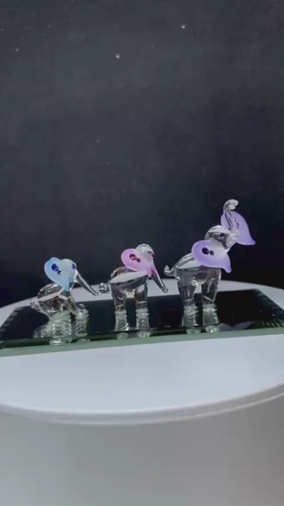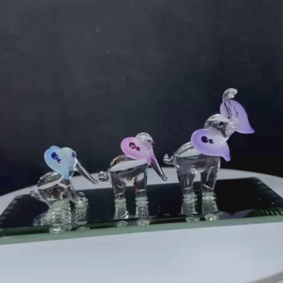 • Three handcrafted glass elephants with airbrushed Amethyst, Rose, and Sapphire-colored ears