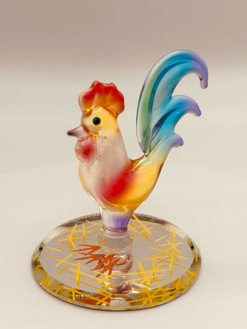 Bring a touch of farmhouse charm to any space with the Sunrise Rooster Glass Figurine. This handcrafted rooster features colorful barnyard detail and stands proudly on display with crystal and 22Kt gold accents.