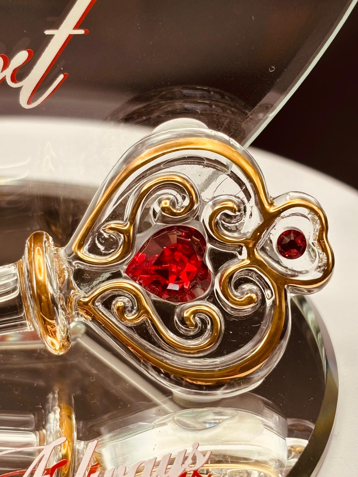 • Handmade glass key with a sentimental message, placed on a mirror base.