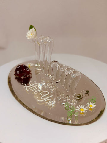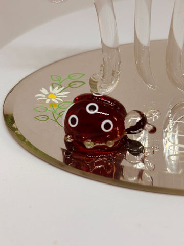 Celebrate your love for Mom with this beautiful handcrafted glass figurine. It features a cute red ladybug and a 3D glass "Mom" design, all placed on a hand-beveled glass mirror. The base is decorated with flowers and the message "Love You" to make it even more special.
