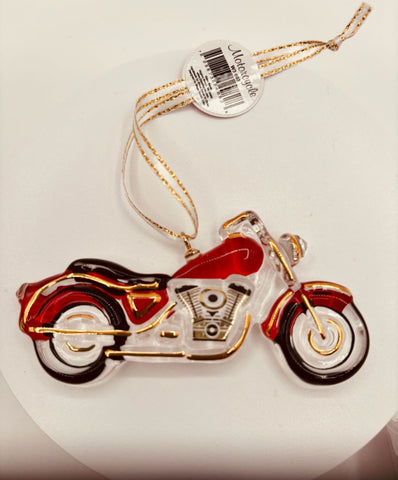 • Handcrafted glass motorcycle ornament hanging from a gold ribbon