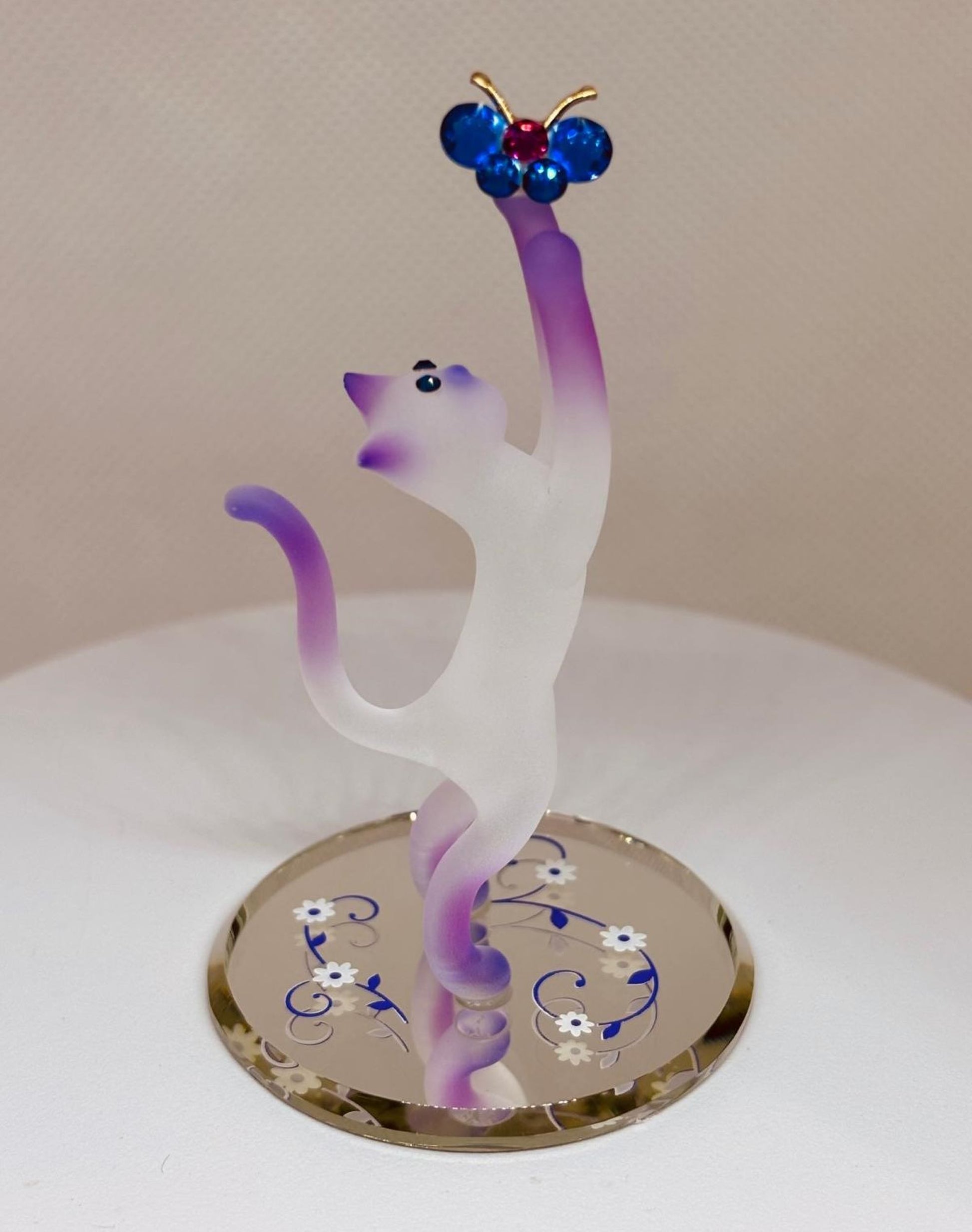 The Princess Cat with Butterfly Figurine is a sweet glass piece made for cat lovers. This handcrafted pink and white cat holds a blue butterfly and is displayed on a decorative hand-beveled glass mirror, making it easy to place on shelves, desks, or nightstands.