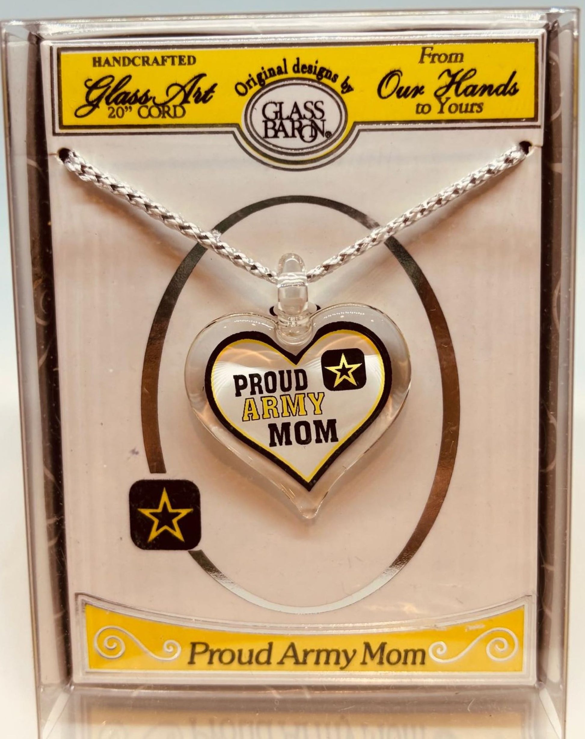 Heart-shaped glass pendant with “Proud Army Wife” embossed