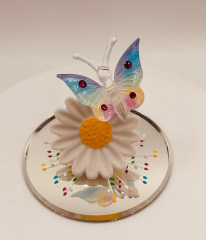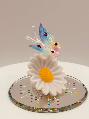 - Handcrafted glass butterfly figurine perched on a daisy