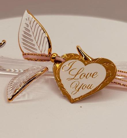 Share a heartfelt message with this handcrafted Pink Rose “I Love You” figurine. The closed pink rose includes a message tag tied with a pink and gold ribbon that reads “I Love You.” This piece is a nice décor accent for shelves, desks, bedside tables, or gift displays.