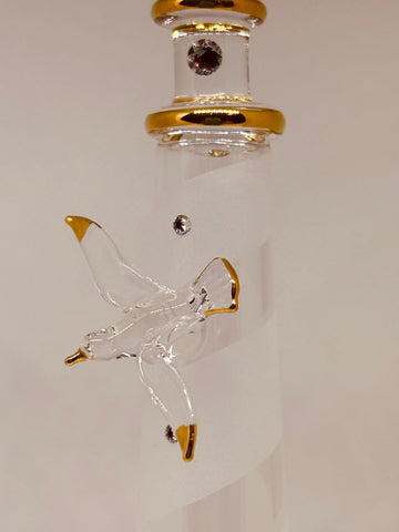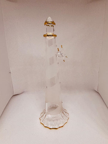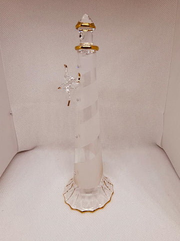 This tall and elegant lighthouse figurine features a beautiful etched spiral design and a detailed glass sea gull, all set on a clear base. It's the perfect touch of nautical charm for any room or collection.