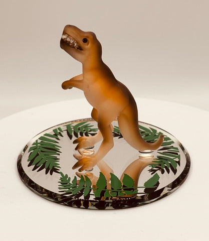 Add a fun dinosaur accent to your home with this handcrafted glass T-Rex figurine. Designed with detailed air-brushing and displayed on a hand-beveled mirror base, this T-Rex makes a great décor piece for shelves, desks, curio cabinets, or collectible displays.