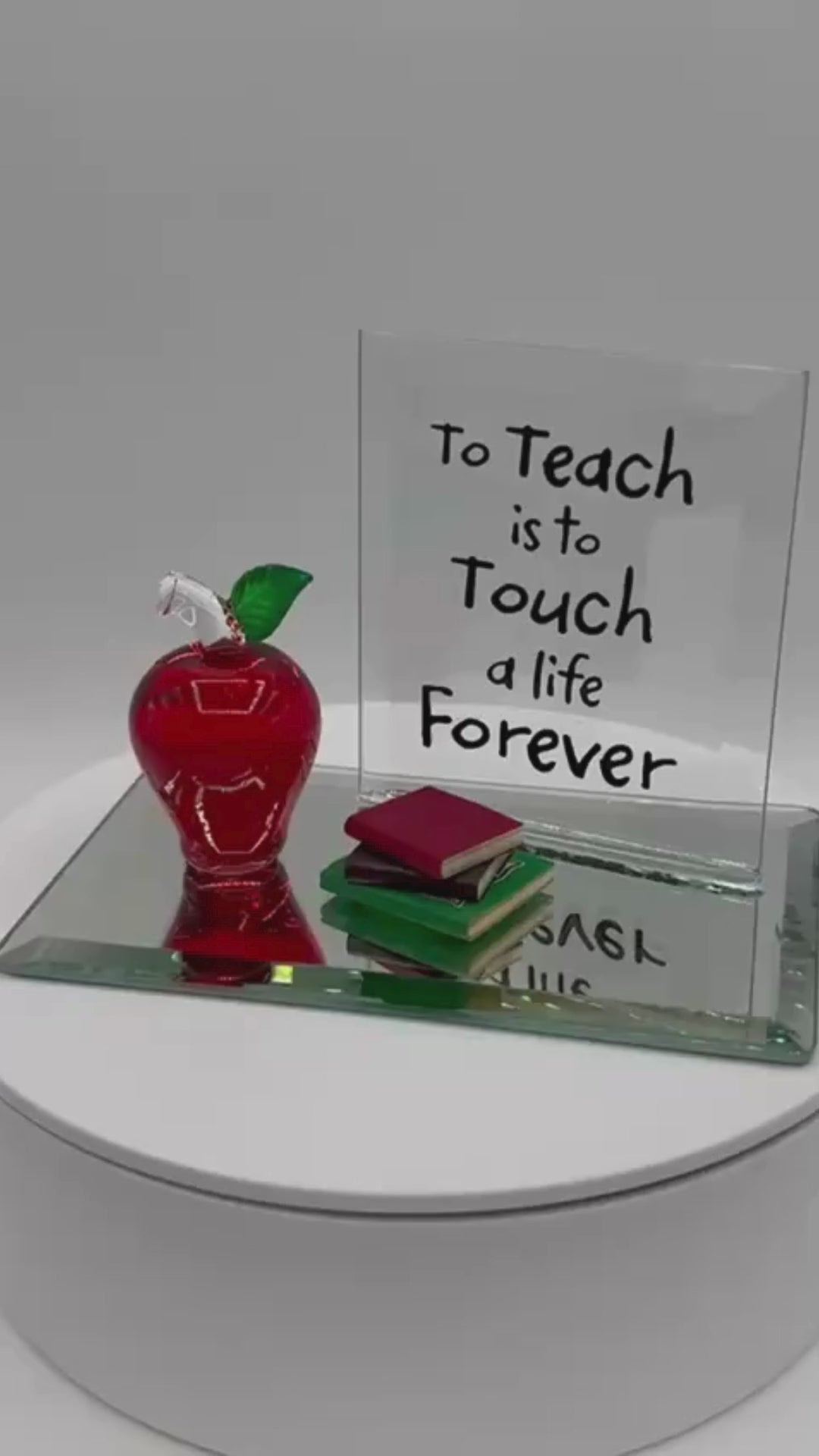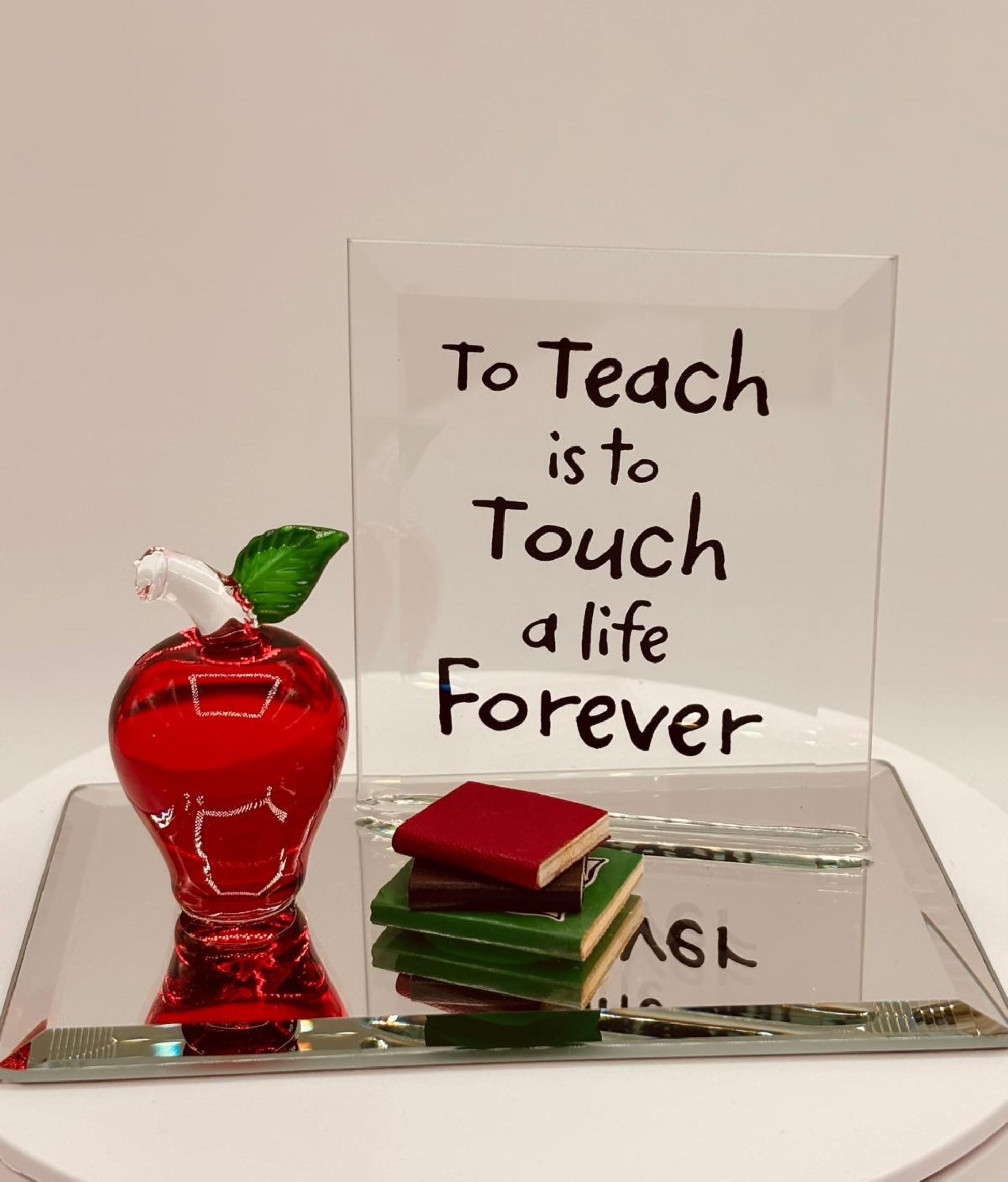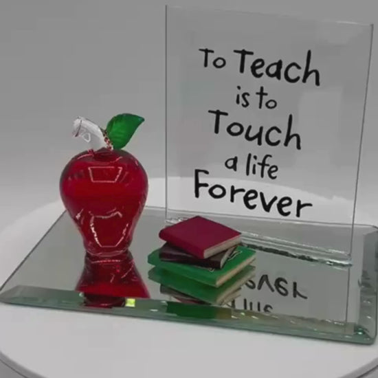 Celebrate the teacher who inspires you with this beautifully handcrafted To Teach Apple with Books Figurine. Featuring a red glass apple displayed on a mirrored base with stacked books and a sentiment back plate, this piece makes a meaningful gift for Teacher Appreciation Day, year-end celebrations, or any moment you want to say thank you.