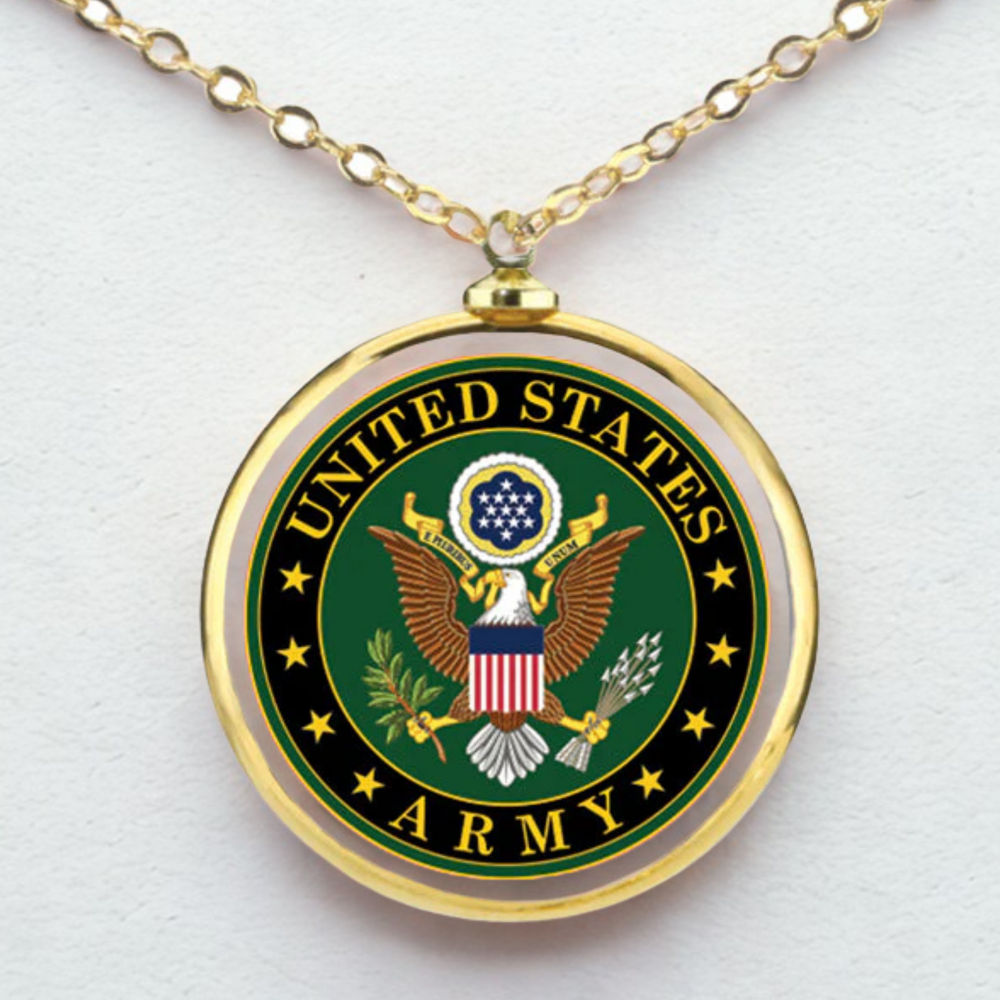 Features the classic U.S. Army emblem beautifully displayed on a handcrafted glass pendant