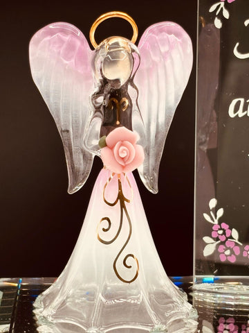 Handcrafted glass angel figurine holding a pink porcelain rose