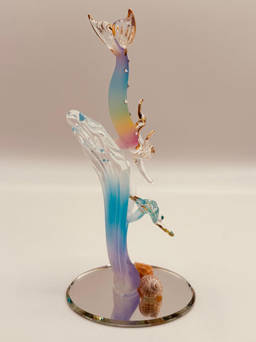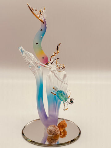 Frolic under the waves with this handcrafted Mermaid and Turtle Glass Figurine. Featuring a graceful mermaid and sea turtle swimming among sea grass on a hand-beveled mirror base, this collectible captures the magic and serenity of the ocean.