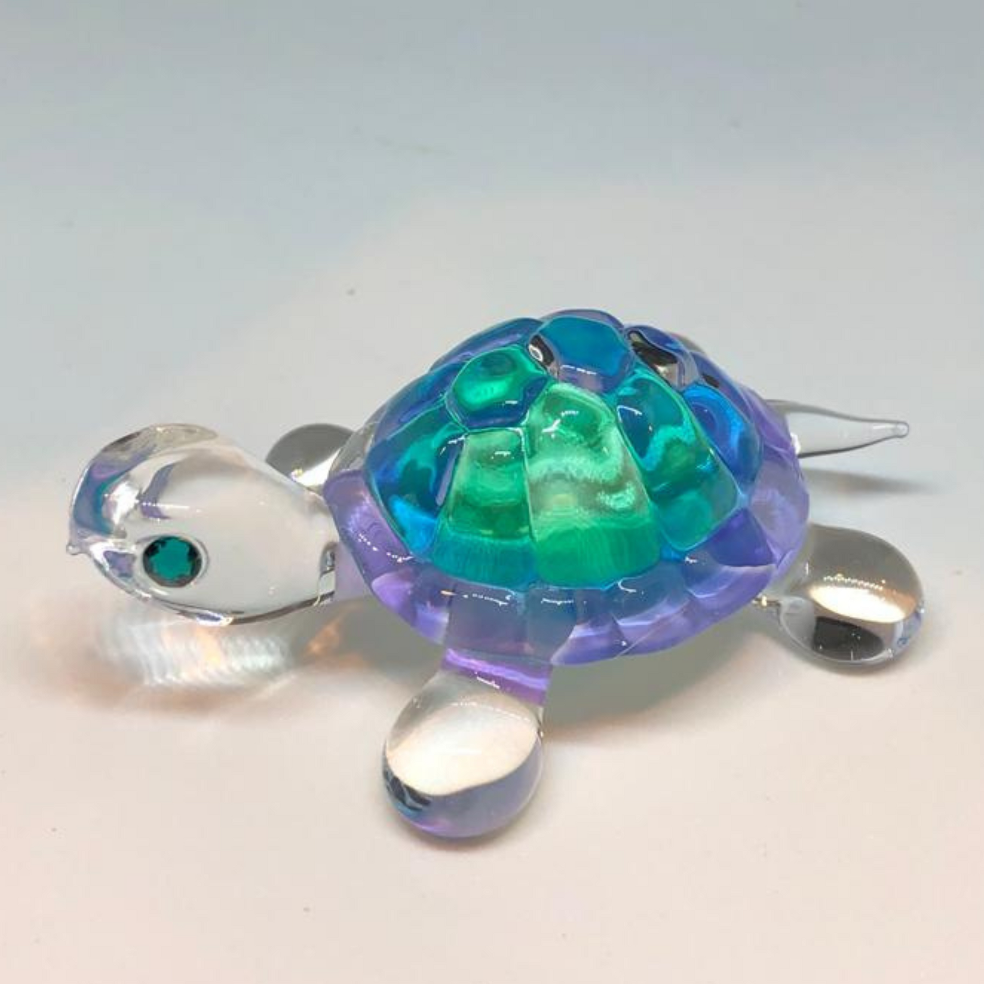 Catch this adorable blue turtle before he runs off on an adventure! This handcrafted glass turtle figurine makes a fun and thoughtful gift for turtle lovers and collectors. Perfect for a shelf, desk, or as part of a beach-themed decor.