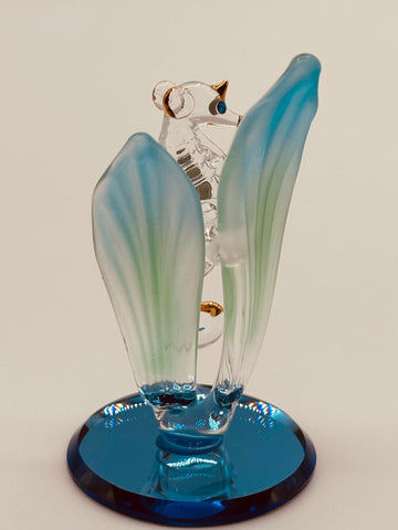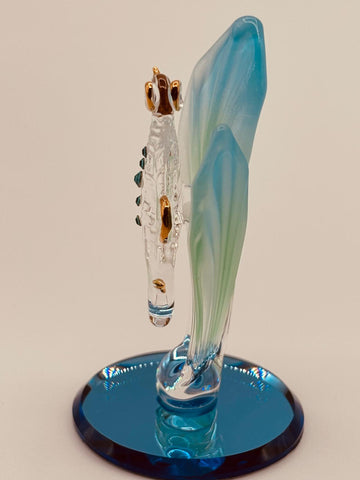 - Handcrafted glass sea horse with sea grass on blue beveled mirror base
